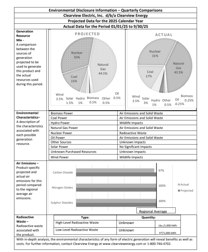 | CRES Provider: | Clearview Electric, Inc. dba Clearview Energy P.O. Box 130659 Dallas, TX 75313-0659 1.800.746.4702 Representatives available Monday – Friday 9:30 a.m. – 6:30 p.m. EST www.Clearviewenergy.com |